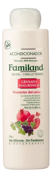 El Acondicionador Granada Hialurónico de Familand está diseñado como un protector del color para cabellos teñidos o con mechas, aportando una intensa hidratación y nutrición a la fibra capilar.